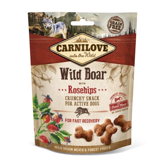 Carnilove Crunchy Snack z dzikiem i owocami dzikiej róży to doskonały przysmak dla psów, które uwielbiają aktywność i potrzebują dodatkowej porcji energii po wysiłku. Chrupiąca struktura smaczków łączy pyszny smak dziczyzny z odżywczymi składnikami pochodzenia naturalnego.
