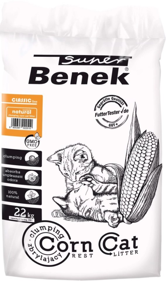 SUPER BENEK Corn Żwirek Kukurydziany Zapach Naturalny to w 100% naturalny, biodegradowalny żwirek kukurydziany dla kota, zapewniający higieniczne i komfortowe korzystanie z kuwety. Drobnouziarniony i o dużej gęstości, ogranicza wysypywanie poza kuwetę, skutecznie zbryla wilgoć i ułatwia sprzątanie przy pomocy łopatki. Dzięki technologii zamykania zapachów utrzymuje świeżość, a pojedyncze bryłki można usuwać w sposób przyjazny dla środowiska, zgodnie z lokalnymi przepisami. Produkt jest bezpieczny dla kota i wygodny dla właściciela, stanowiąc praktyczne i ekologiczne rozwiązanie do codziennego utrzymania czystości w kuwecie.