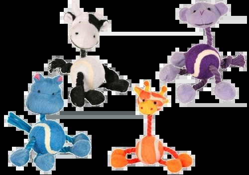 Zabawka z piłką i sznurkami w formie zwierzątek - 16 cm to zabawka do przeciągania i aportowania dla psa. Produkt został wykonany z miękkiej piłki tenisowej, która sprawia, że rzucona zabawka leci daleko i dobrze odbija się od podłoża, uciekając w niespodziewanym kierunku. Wszystkie elementy połączone są sznurkami z bawełny, barwionymi nietoksycznymi farbami.