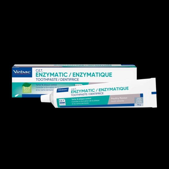 Enzymatyczna pasta do zębów firmy Virbac jest smaczną pastą stworzoną z myślą o psach i kotach, zawierającą opatentowany kompleks C.E.T. (Complex Enzymatic Thiocyanate) w skład którego wchodzą 2 enzymy (oksydaza glukozowa, laktoperoksydaza) i tiocyjanian potasu. Kompleks ten wzmacnia naturalne mechanizmy obronne jamy ustnej. Aromat drobiowy sprawia, że psy i koty dobrze tolerują smak pasty. Nie jest wymagane płukanie jamy ustnej po jej zastosowaniu.